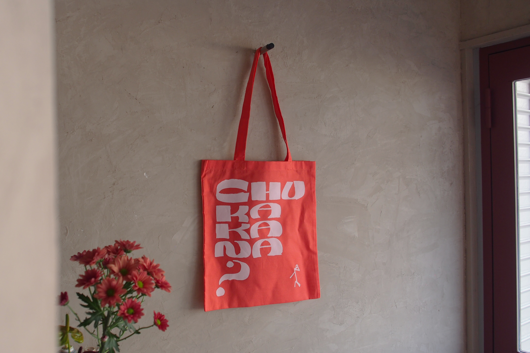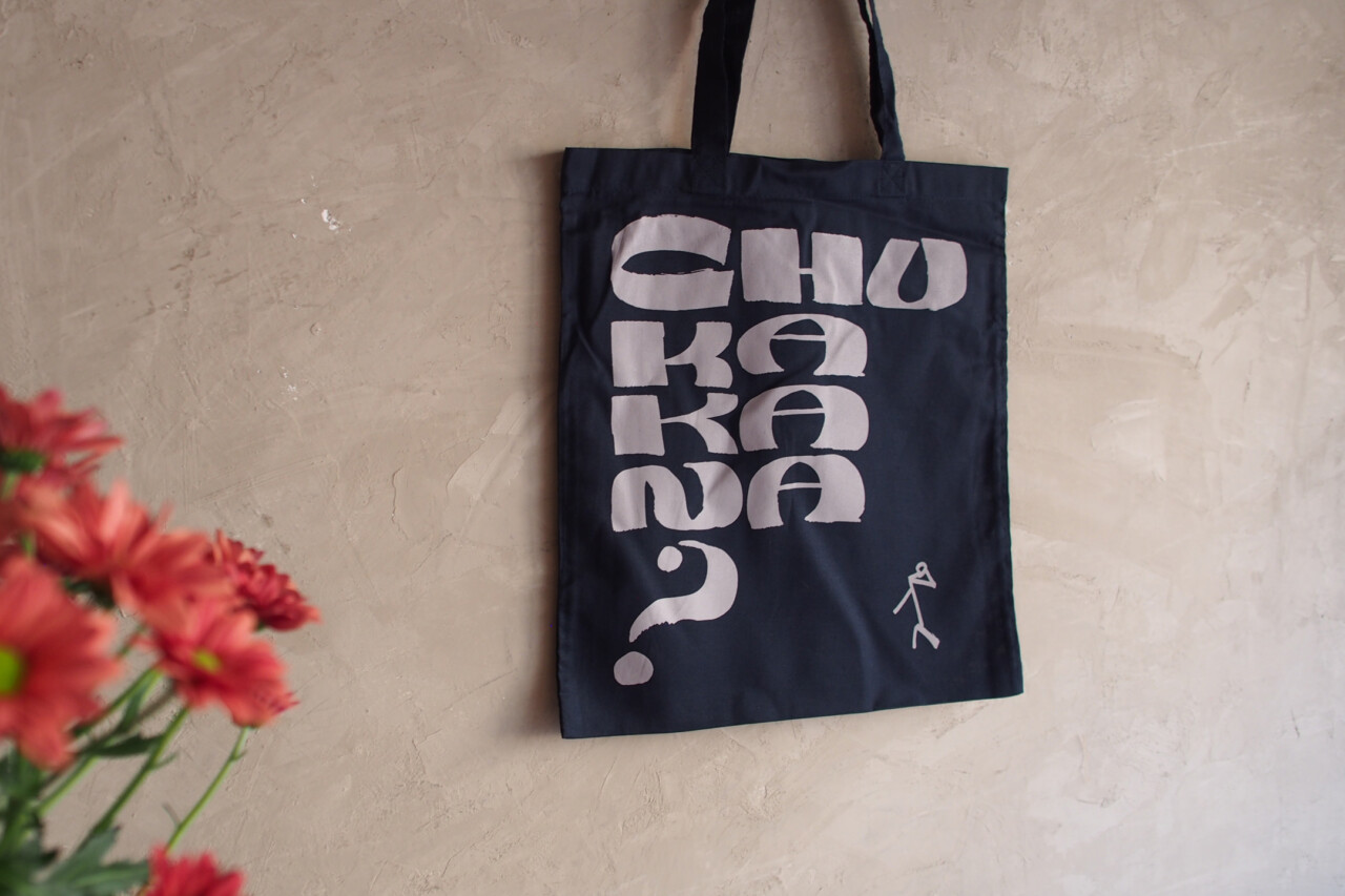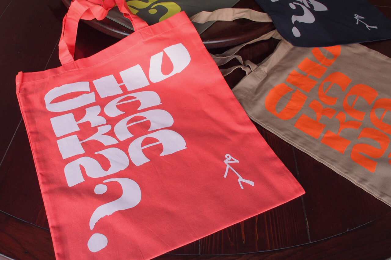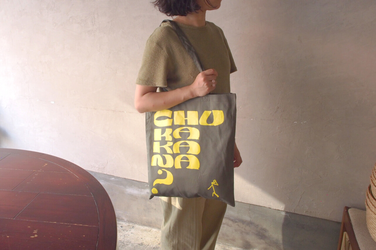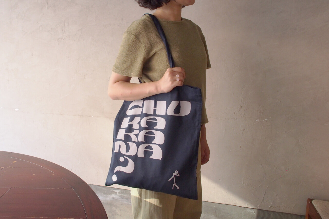 東京都永福町にある「中華可菜飯店(ちゅうかかなはんてん)」のオリジナルグッズでトートバッグをデザイン。「chukakana?」というテキストにあわせて、棒人間が小首をかしげたシンプルで愛嬌のあるデザインに。