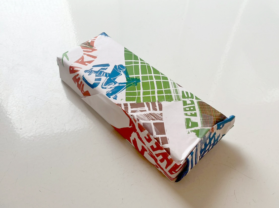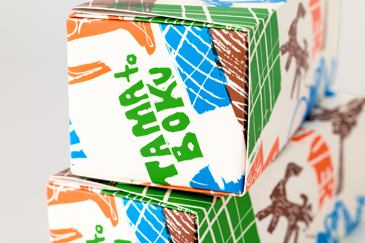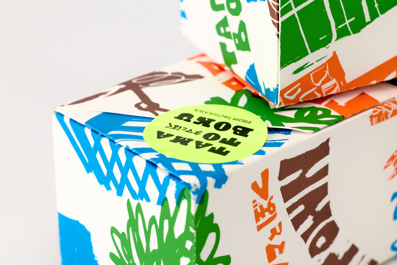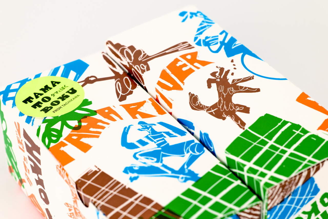 お土産の理想的な佇まいの代表格として“包装紙”の存在があった。そのお店ならではの趣向を凝らしたデザインは、おもてなしの心であり、大衆へのアピールというよりも、とても個人的なメッセージにも感じる。そんな包装紙の持つ文化的な滋味深さをどこか感じるパッケージにしたかった。紙を畳んだり折り込んだりすることで、違う景色が出来上がる。一枚の絵を箱に巻くことで生まれるドラマをいくつも試し、パッケージに取り込むチャレンジをした。
