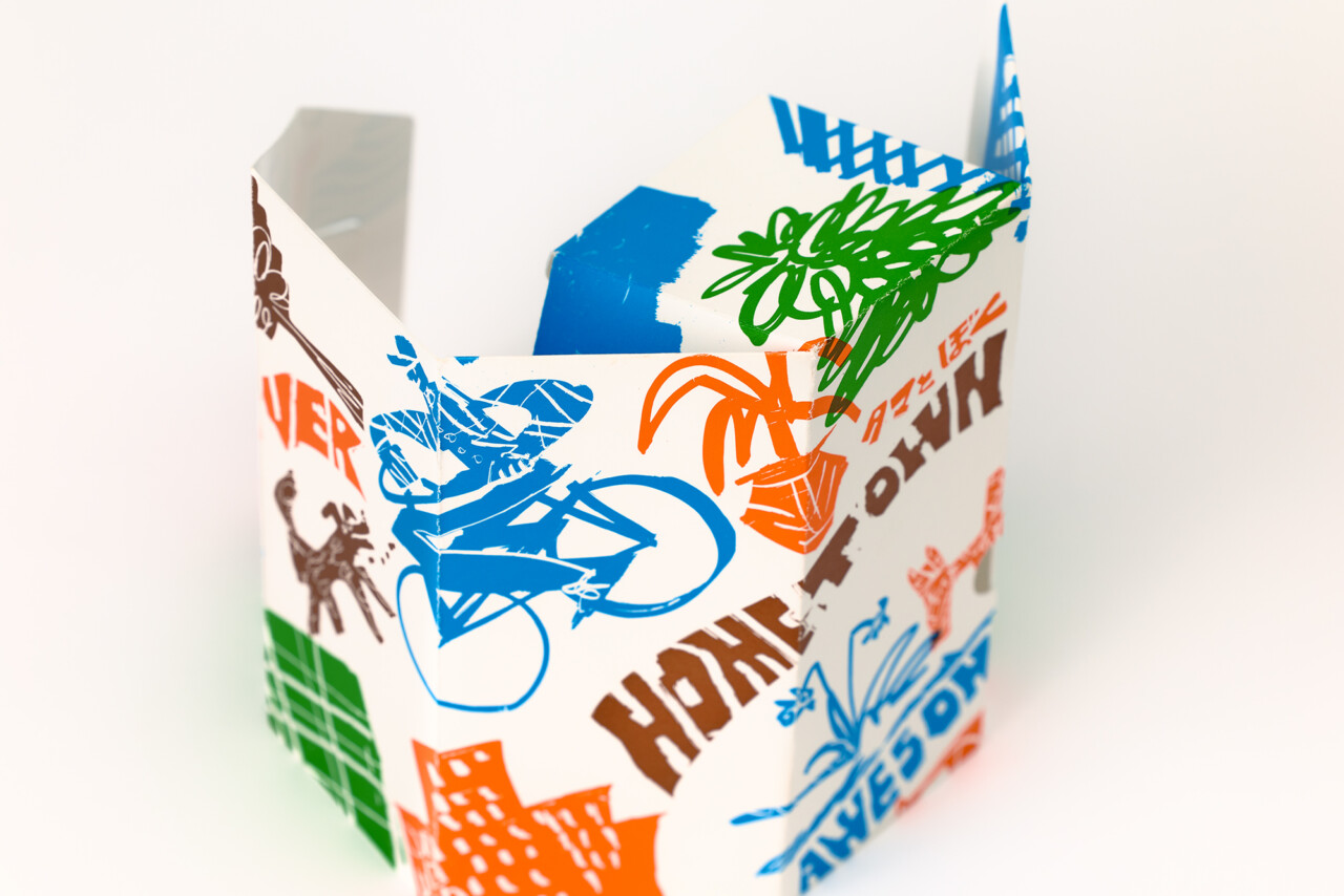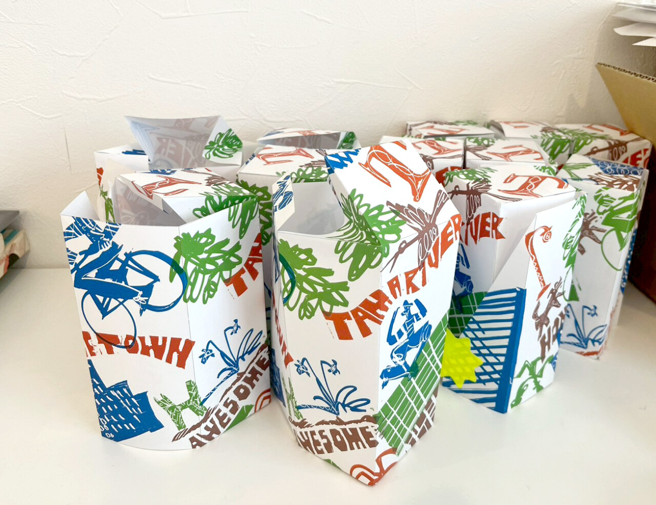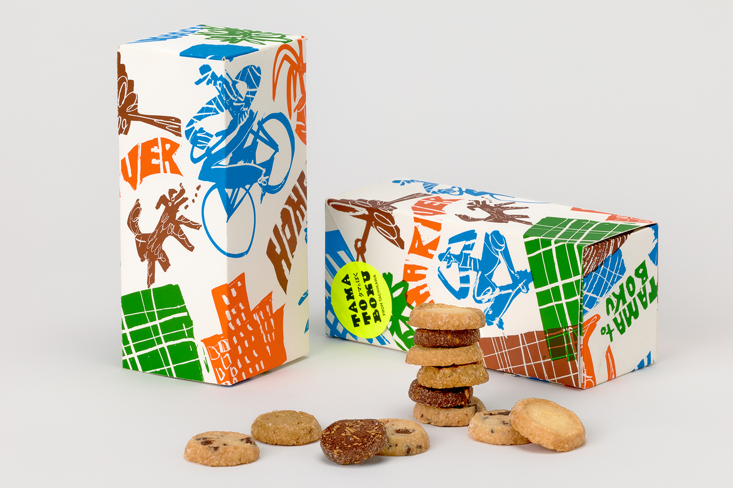 お土産の理想的な佇まいの代表格として“包装紙”の存在があった。そのお店ならではの趣向を凝らしたデザインは、おもてなしの心であり、大衆へのアピールというよりも、とても個人的なメッセージにも感じる。そんな包装紙の持つ文化的な滋味深さをどこか感じるパッケージにしたかった。紙を畳んだり折り込んだりすることで、違う景色が出来上がる。一枚の絵を箱に巻くことで生まれるドラマをいくつも試し、パッケージに取り込むチャレンジをした。